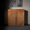 Introduce natural charm and modern design into your space with this solid wood storage cabinet, featuring dual drawers and rattan shutter doors with a circular inlay design. Handcrafted from premium wood with natural cane detailing, this piece is both functional and artistic.