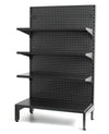 This metal display rack with a perforated back panel allows flexible arrangement of hooks, shelves, or accessories β making it ideal for displaying tools, merchandise, or decor.
