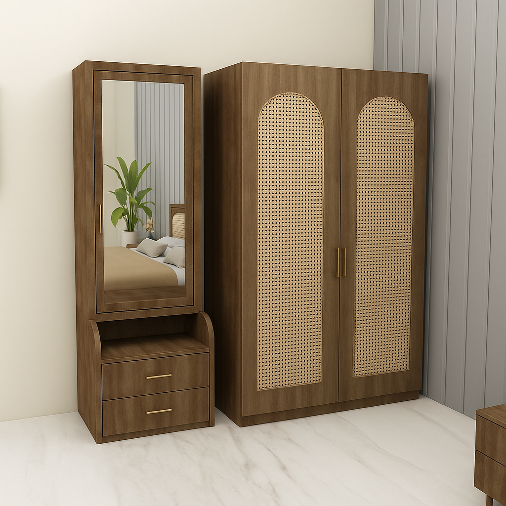 Experience the perfect fusion of natural elegance and modern minimalism with the Cane Harmony Bedroom Collection. Designed with premium engineered wood in a rich walnut finish, this set features a beautifully handwoven cane headboard, adding warmth and texture to your bedroom. The clean lines, muted tones, and thoughtful detailing create a serene, sophisticated ambiance, making it the perfect choice for contemporary homes.